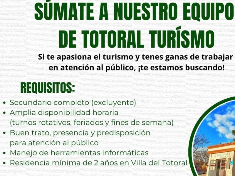 Convocatoria abierta para incorporar personal al equipo de Totoral Turismo